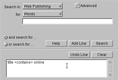 Click Add Line to add the first part of the query. The word appears in the large text display box at the bottom of the form.